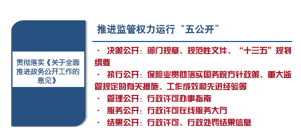 中国保监会努力贯彻《关于全面推进政务公开工作的意见》关于行政权力运行“五公开”的要求,推动监管工作全环节信息公开。一是推进决策公开。所有涉及保险业发展和公众利益的部门规章、规范性文件,在出台前均通过网站公开征求意见。在制定保险业“十三五”规划纲要的过程中,也向社会公开了意见征求邮箱,广泛听取意见。二是推进执行公开。通过网站专题、系列报道等形式,全面展示保险业贯彻落实国务院方针政策、重大监管规定的有关措施、工作成效和先进经验等。三是推进管理公开。系统梳理了保监会行政许可项目的种类、依据、受理机关、审查原则、办理时限等要素并在网站公开,为行政对象提供便利。四是推进服务公开。开通行政许可在线服务大厅,提高办理效率和服务水平,保障行政对象的知情权和监督权。编制优化信访、消费投诉、依申请公开、公文报送等指南信息,简化办事流程,提升服务水平。五是推进结果公开。行政许可、行政处罚等监管权力行使形成的结果信息,均在第一时间对外公开,接受社会监督,促进保险市场健康有序发展。