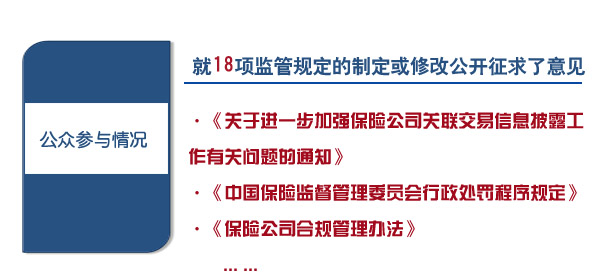 2016年,中国保监会就《关于进一步加强保险公司关联交易信息披露工作有关问题的通知》、《中国保险监督管理委员会行政处罚程序规定》、《保险公司合规管理办法》等18项监管规定的制定或修改向社会公开征求了意见。中国保监会还通过各类互动渠道,听取了保险消费者的意见建议,回应社会关切。