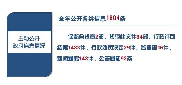 中国保监会进一步做好涉及公众利益重要监管信息的主动公开,保障人民群众知情权和参与权。2016年全年通过网站等载体公开各类信息1804条,包括保监会规章2部、规范性文件34部、行政许可结果1483件、行政处罚决定29件、监管函16件、新闻通稿148件、公告通知92条。